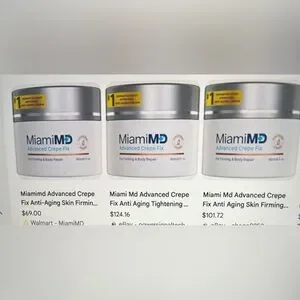 MiamiMD Advanced Crepe Fix cream for firming and body repair. Comes in a sleek white and silver container. See photo of prices listed on Amazon for comparison. THIS IS A DEAL!!