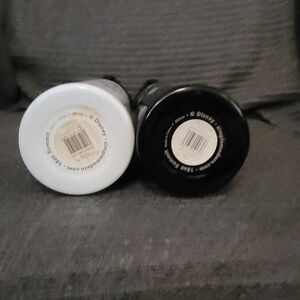 Set of two Disney water bottles featuring Mickey Mouse and Olaf designs. One bottle is white with Mickey Mouse pattern, and the other is black with Olaf pattern.