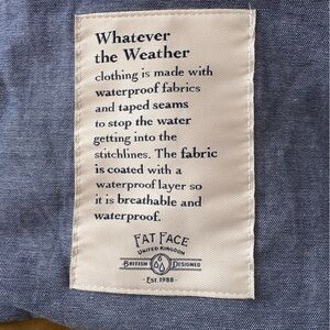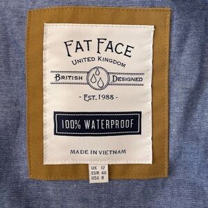 FatFace UK Brand jacket made for rainy days with waterproof fabric and sealed seams. Lightweight, soft, and breathable materials. Amazing craftsmanship.
