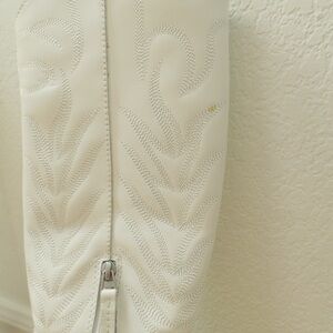 Classic yet chic, these white western-style knee-high boots feature intricate stitched detailing, side zipper for easy wear, and a comfortable stacked block heel. Perfect for pairing with dresses, skirts, or jeans, these boots add a stylish cowboy-inspired touch to any outfit. Gently worn and in good condition with a clean, modern look. Slight dot stain on the right boot as shown in the photo.