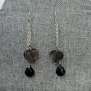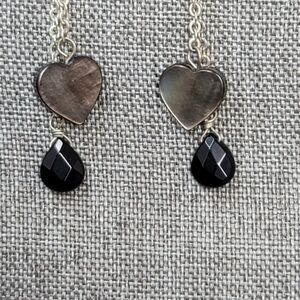 Abalone Heart Earrings Shell Silvertone Dangle Double Chain Black Teardrop Beads