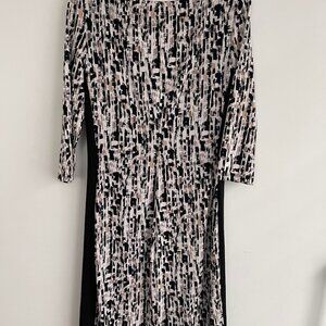 Elegant midi dress with abstract black and white pattern. Features three-quarter sleeves and a flattering silhouette.