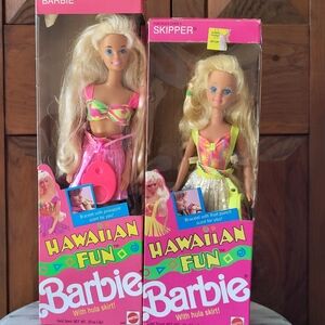 1990 Barbie dolls in vibrant Hawaiian attire. Includes colorful hula skirts and accessories. Barbie and Skipper. New. $80.