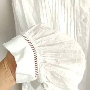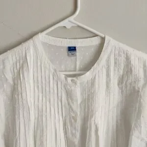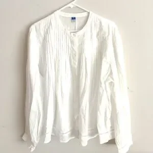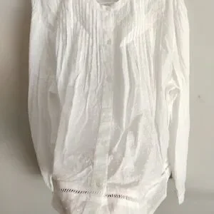 Elegant white button down shirt. Features pleated front. Long sleeves with button cuffs. Perfect for casual or formal wear.