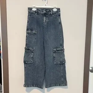 Trendy cargo jeans with multiple pockets. Comfortable and stylish for everyday wear. Size 10. Adjustable waistband.
