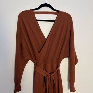 Stylish brown knit dress with a wrap design. Ideal for versatile wear.