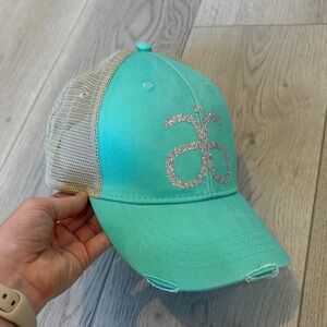 Stylish turquoise cap with silver logo. Features breathable mesh back. Perfect for casual wear. New, never worn.