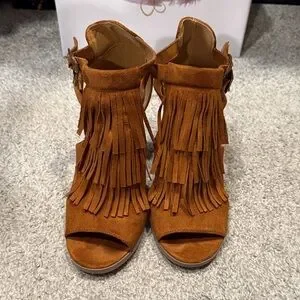 Step out in style with these chic brown fringe heeled sandals. Perfect for adding a bohemian touch to any outfit. Worn like twice. Suede-like material. 7.5. No Box