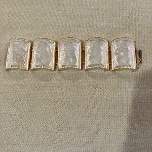 Lalique crystal and gold plated NYSA Enfant Cherub cuff bracelet. Extra link included. Original bracelet size 6 1/2 inches. Additional link is 1 1/4 inch. Total length 7 3/4 inches. . Perfect condition. Original Lalique box included.