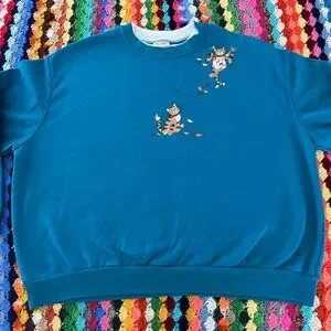 Vintage Y2K Cat Embroidered Patchwork Morning Sun Teal Double Collar Ove…