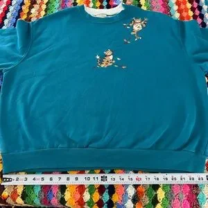 Vtg 2000s Top Stitch Tabby Kitten Fall Autumn Leaves Jersey Knit Crewneck Pullover Sweatshirt Mockneck Hang in There