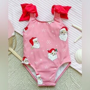 Adorable pink swimsuit featuring Santa Claus print and red bows. Perfect new condition.