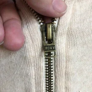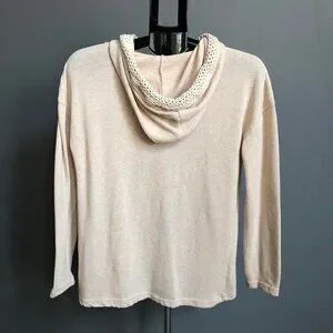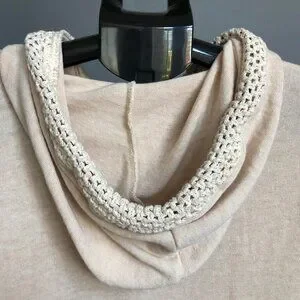 Cotton, rayon, poly blend hooded full zip sweater from Roxy is the perfect lightweight transition layer. Cute, multicolored tie runs through the openwork knit of the hood. Hoodie is in great shape with no stains, snags, or holes.
