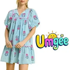 Missing You Blue Floral Dress by Umgee. This dress features intricate embroidered floral details in a blue hue, accented with sweet pink trimmings.