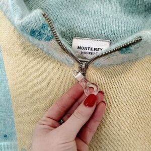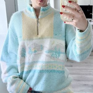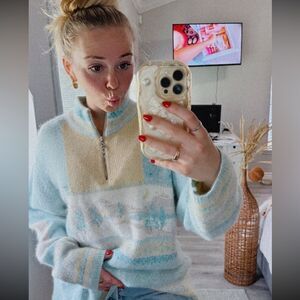 Stay warm and stylish with this cozy blue and cream sweater. Perfect for any casual outing.