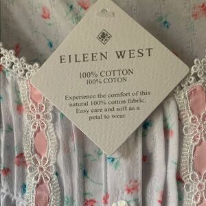 Experience comfort and style with this sleeveless Eileene West nightgown, featuring a delicate pink pattern on a white background. Perfect for a restful night's sleep.