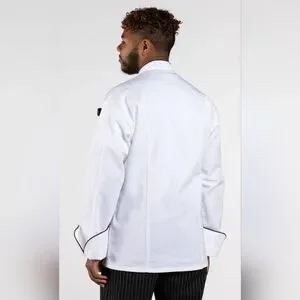 Elevate your culinary style with this sleek white chef jacket featuring black trim. Perfect for professional kitchens.