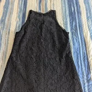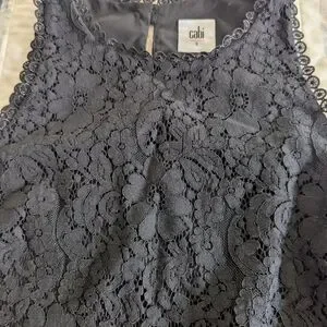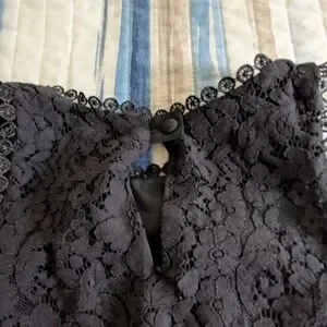 Stylish black top with lace accents and eyelash trimmed bottom. Ideal for elegant outings or even a pair of jeans. Very versatile, cute piece. Excellent condition.