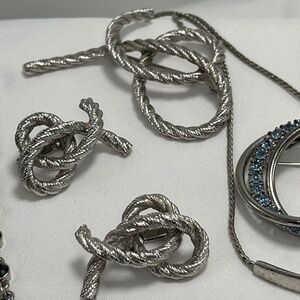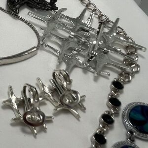 SEE PHOTOS. 2 brooch and clip earring set in silver tone. 2 brooches. 1 blue abalone bracelet w/1 post earring, and a pendant. 1 silver and blue multi stone net/ cascade necklace, and a pair of earrings with blue stones. 1 silver necklace with a blue connected stone (marked Sarah) Coventry.