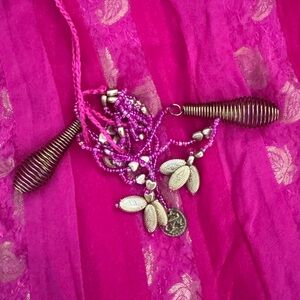 Vibrant fuchsia dress with gold detailing. Features intricate patterns and elegant design.