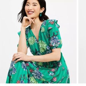 Loft by Ann Taylor Floral Ruffle V-Neck Midi Dress in Lush Meadow Flowy Size M
