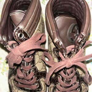 Elegant Gucci high-tops with signature pattern. Brown and cream tones. Perfect for casual wear.