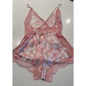 Naked Princess Women’s Silk Ella Romper Lingerie Pink Petal Print Silk Lace READ