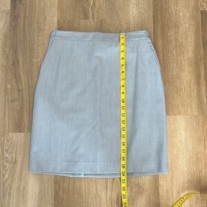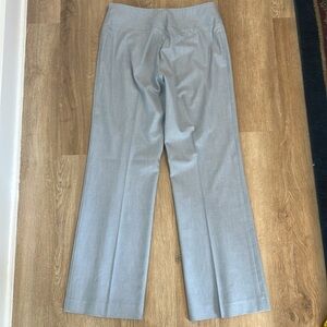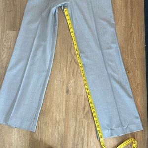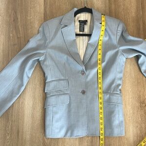 BCBG MaxAria three piece suit light blue/gray. Includes jacket, pants and skirt all in great preowned condition. Double breasted with three faux pockets in the front. Zip closure to both pants and skirt along with clasp. No stains or snags. All pieces are size 6. 49% polyester, 49% rayon and 2% spandex. Dry clean only. Very nicely made put together suit. Approximate measurements laying flat please see pictures.