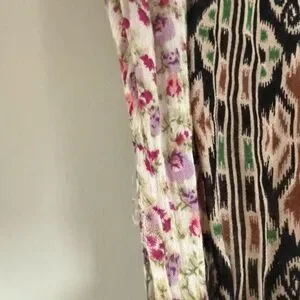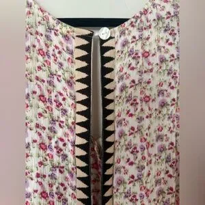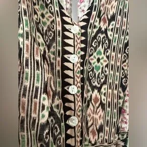 Super cute and light weight. Fully lined pockets. Some light fraying on arm holes. Isn’t very noticeable but have included photos. Super cute print that I haven’t seen frequently. Buttons in front with mother of pearl buttons. Back is open with button at top. Size xs, Cropped length