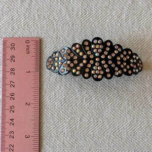 Beautiful peach and peach aurora borealis crystals adorn this well made black metal barrette.