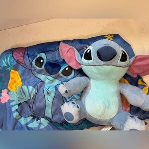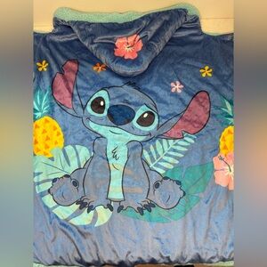 Cozy blue hooded blanket featuring Stitch with floral and pineapple accents.