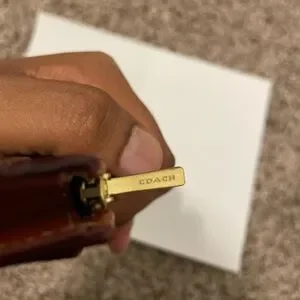 Stylish Coach card holder with New York patches. Tan and orange design. Perfect for organizing cards.