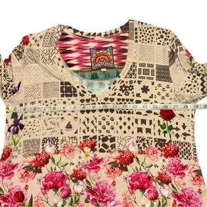 This Johnny Was Mystery Print Ladies V-Neck Tee is a trendy must-have with a boho-chic look. Made from a soft bamboo and spandex blend, it features a vibrant floral print, V-neckline, long sleeves, and a hip-length hem. Ideal for a comfortable yet stylish addition to your wardrobe.