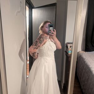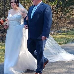 This elegant white lace wedding dress is perfect for your special day. Featuring intricate lace detailing, it offers a timeless and sophisticated look. will also include the garment bag. I will also include the Veil (if you'd like it). the Veil itself was $1000.