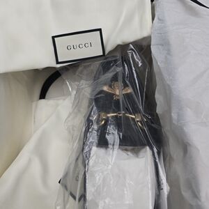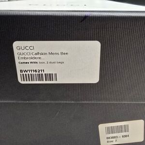 Sleek black leather loafers. Features gold bee design. Classic horsebit accent.