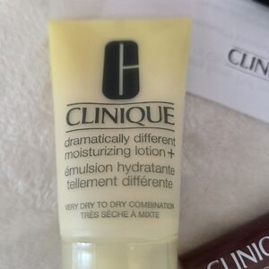 New Clinique bright lip print cosmetic bag with skincare, mascara, and lipstick. Includes: