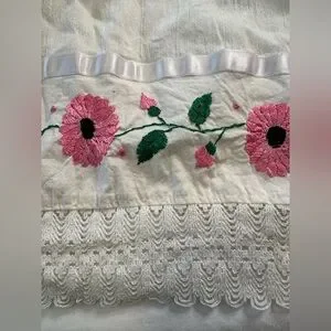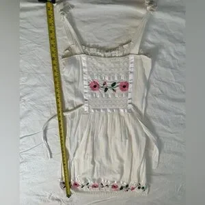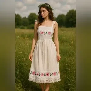 Romantic cottagecore embroidered midi dress with pink floral motifs and boho ribbon detail. Woven cotton-linen feel with satin trim and crochet hem add artisan charm. Adjustable tie straps, smocked elastic back, and self-tie waist offer flexible fit. Bodice features lace + ribbon panel with floral embroidery. Lined skirt; no stretch in skirt portion.