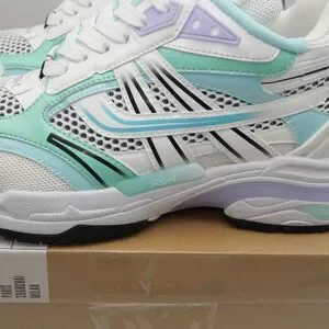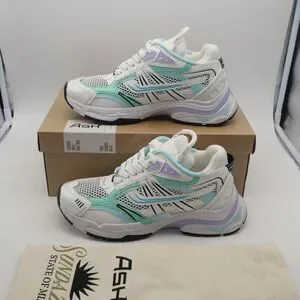 Stylish Ash athletic shoes. Features a white base with mint and lavender accents. Perfect for active wear.