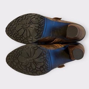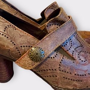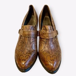 Retro Chunky Heeled Leather Slip on Heels Sz 41. Heeled leather loafer. Laser etched perforated detail, a saddle strap with an antique accent. Heel measures 3". Color is olive green leather with ombre towards heel changing to a rust orange. These are gorgeous!