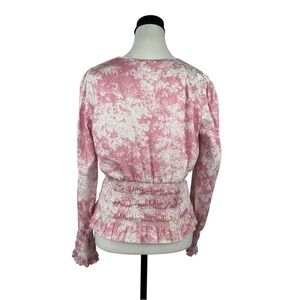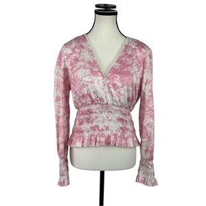 WAYF Pink Toile Print Smocked Peplum Blouse L Long Sleeve Wrap Cottagecore