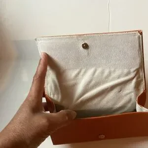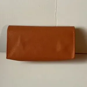 Elegant orange clutch with gold logo detail. Perfect for any occasion.