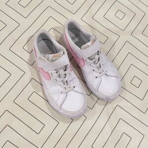 Size 13.5. White flat sneakers with pink swoosh and tan back heel. Velcro top strap with stretch laces. In GUC just need to clean edges. I-115
