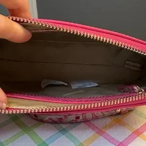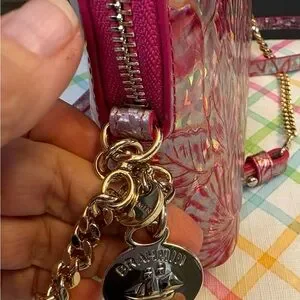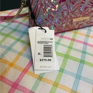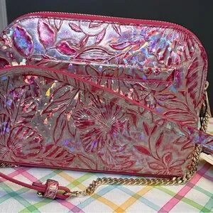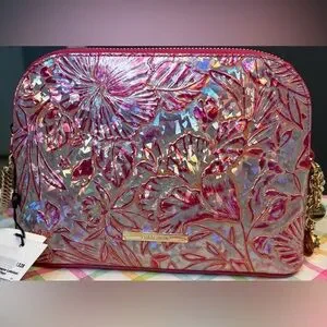 Elegant crossbody with floral pattern. Features coral and iridescent hues.