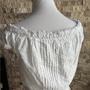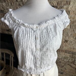 Chic white blouse with ruffled neckline. Button-down front. Perfect for casual elegance.