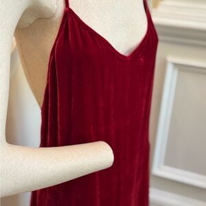 Reformation chic rouge deep rich red velvet velour dress gown velvet slip dress with a v neckline and cross back straps.