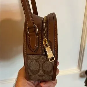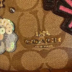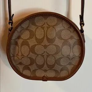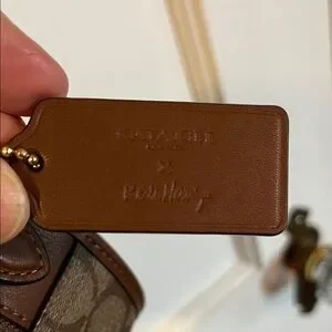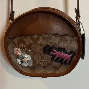 Chic round Coach special edition Keith Haring crossbody in brown and tan. Features playful patches. This purse is in excellent pre-loved condition and will be a unique addition to your Coach Collection. This bag is clean without any signs of wear or any odors.