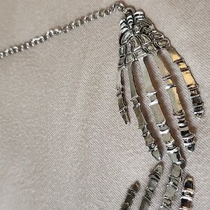 Edgy and stylish, this silver skeleton hand necklace adds a unique touch to any outfit. Perfect for those who love bold accessories.