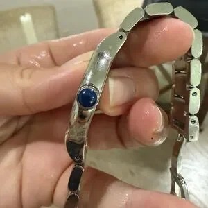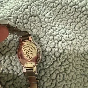 Stylish Raymond Weil watch. Silver band with white dial. Roman numerals and crystal markers.