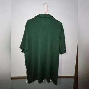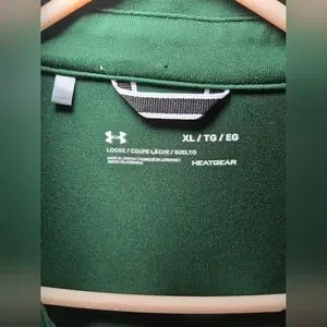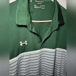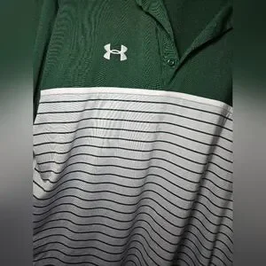 This is a men's XL Under Armour Polo Shirt in green with stripes. It features a collared neckline with a button closure and short sleeves. The shirt is part of the HeatGear performance line, suitable for golfing and casual wear. Made with lightweight, breathable fabric for comfort, this regular fit shirt has a chest size of 24 inches and a length of 31 inches.