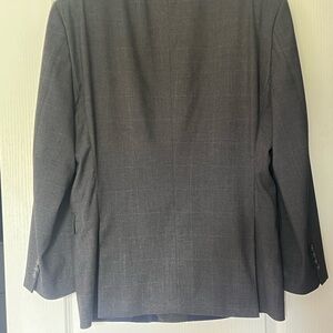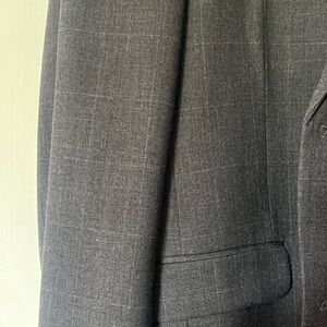 This is a charcoal grey Tommy Hilfiger suit with light white checkered lines. It’s in slightly worn condition with no major signs of damage or wear. The suit includes a two-button blazer and matching pants. Clean, classic, and great for work or formal events. Stylish, comfortable, and well-made.